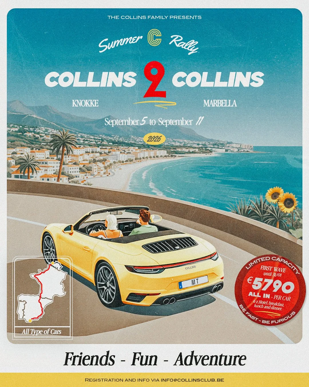The Collins2Collins Summer Rally was born from one of Maxim’s bucket list dreams: driving from Collins Beach Knokke all the way to Collins Terraza Marbella — together, road after road, coast after coast, moment after moment.